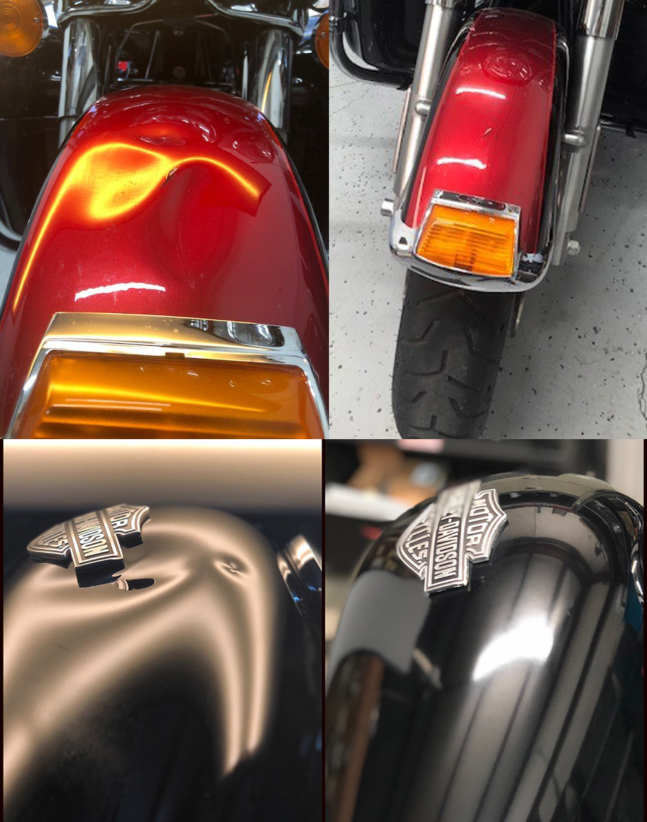 Motorcycle gas tank and fender repairs using Dent Squad's motorcycle paintless dent repair (MPDR) method is the most preferred and cost effective way to preserve your factory or custom finish. We understand motorcycle owners are passionate about their bikes, and so is Dent Squad when it comes to dent removal on motorcycle tanks and fenders. Let our decades of experience bring back your tank or fender to its original pre-accident condition.